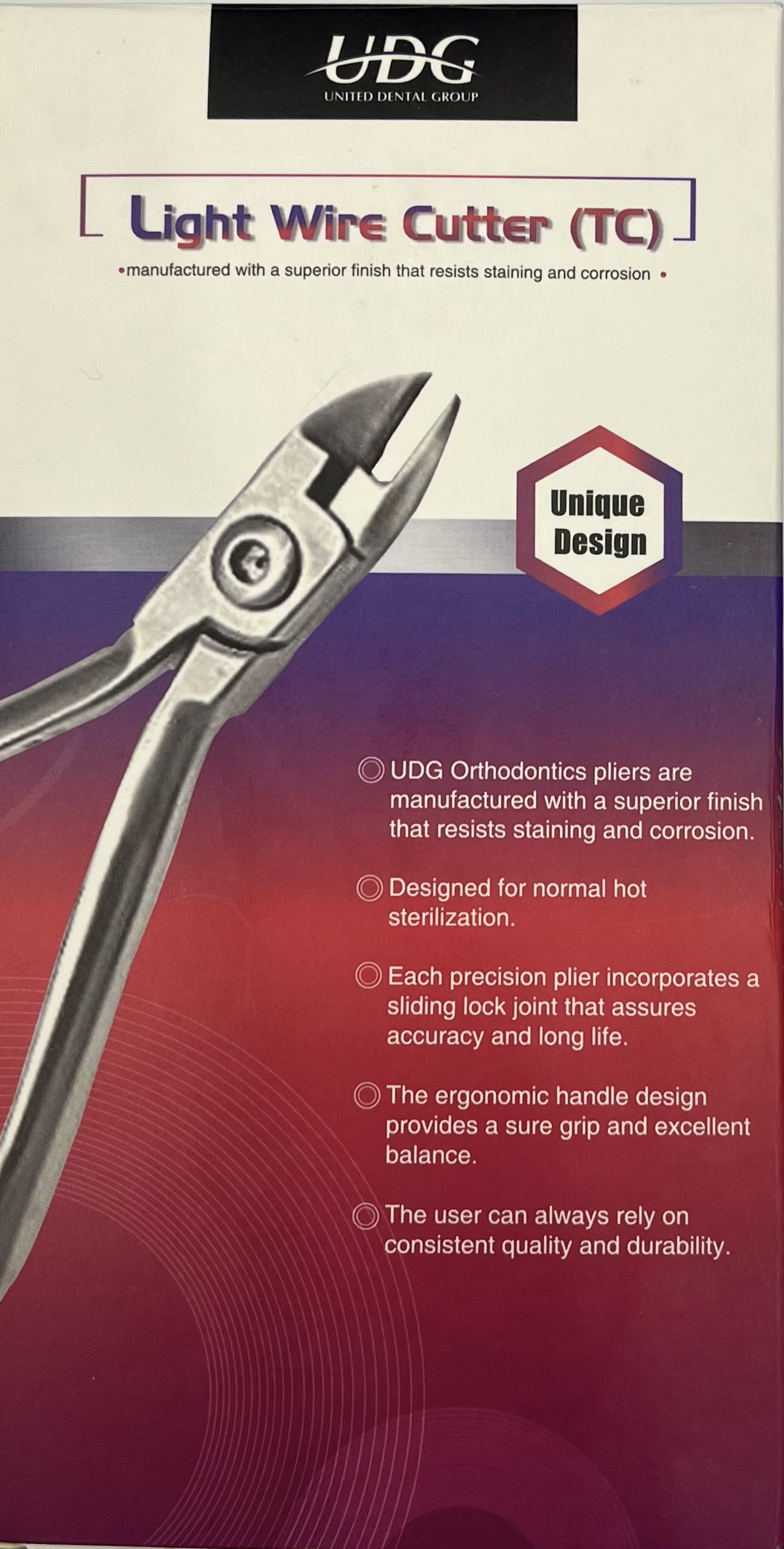 پلایر لایت وایر کاتر ساخته شده از جنس استیل ضد زنگ با مقاومت و دوام بالا و با قابلیت اتوکلاو، انتخاب خوبی برای خم کردن آرچ وایرهایی با قطر کم تا قطر 0.016 اینچ میباشد. Beak های مخروطی بلندتر این پلایر خم شدن آرچ وایرهای با قطر کوچک را آسانتر میکند. این پلایرها خواص ضد اکسیداسیون و ضد خوردگی داشته و نوک آن خم و شکسته نمیشود.