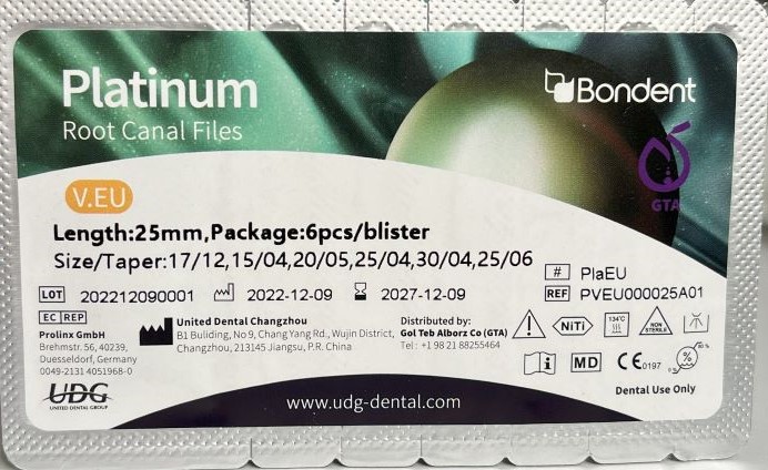 فایلهای Platinum V.EU با فناوری پیشرفته پولیش و نانوپوشش تولید شدهاند که باعث افزایش مقاومت به خستگی چرخهای و کاهش خطر شکستگی فایل میشود. این فایلها با استفاده از عملیات حرارتی جدید، انعطافپذیری را بدون کاهش کارایی برش افزایش داده و دارای نانوپوشش آبی هستند. این محصول برای درمانهای اندودنتیک طراحی شده است. این فایلهای اندودنتیک با بستهبندی برند UDG، از گروه Bondent عرضه میشوند.